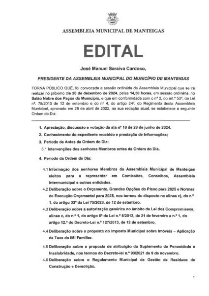 Assembleia Municipal de 20-12-2024 – Ordem de Trabalhos