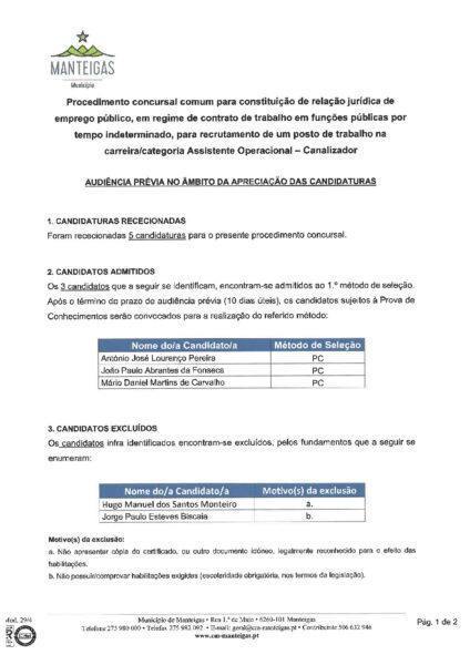 Audiência Prévia no Âmbito da Apreciação das Candidaturas – Procedimento Concursal – Canalizador
