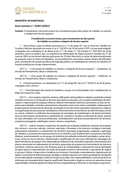Aviso de abertura – Procedimento Concursal – Técnico Superior – Arquitetura (Extrato DR)
