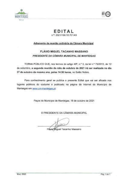 Edital – Adiamento da Reunião Ordinária da Câmara Municipal