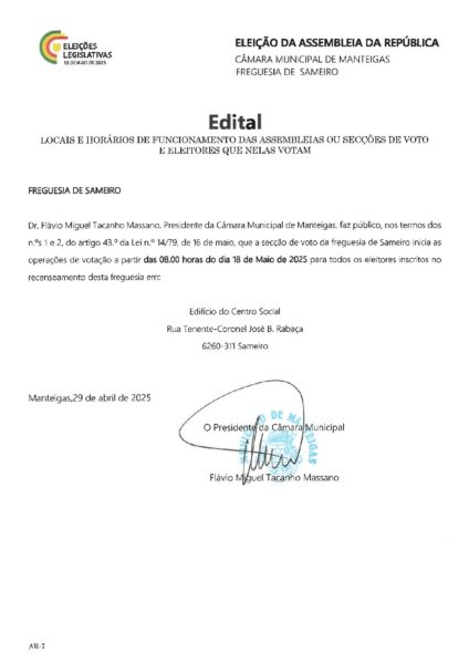 Edital – Locais e Horários de Funcionamento das Assembleias ou Secções de Voto – Sameiro