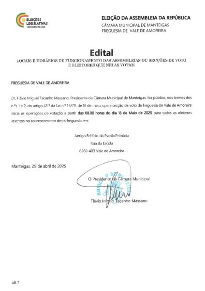 Edital – Locais e Horários de Funcionamento das Assembleias ou Secções de Voto – Vale de Amoreira