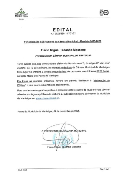 Edital – Periodicidade das Reuniões de Câmara – Mandato 2025-2029