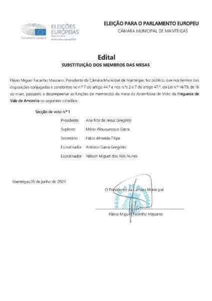 Edital – Substituição dos membros da Mesa de Voto – Freguesia de Vale de Amoreira