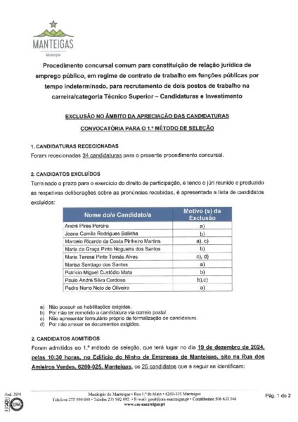 Exclusão no Âmbito da Apreciação das Candidaturas e Convocatória para o 1º Método de Seleção – Candidaturas e Investimento