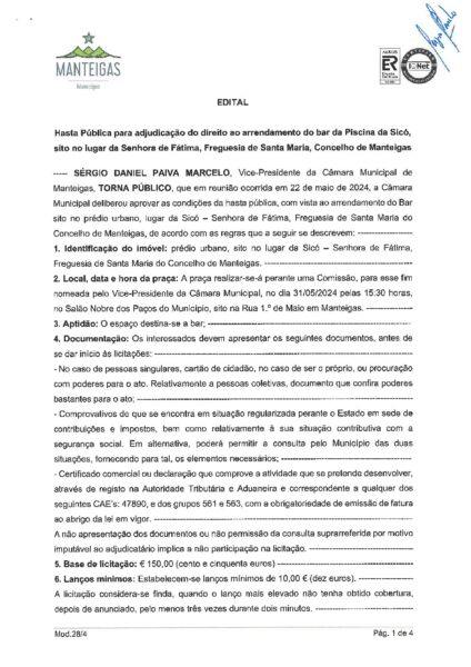 Hasta Pública para adjudicação do direito ao arrendamento do bar da Piscina da Sicó, sito no lugar da Senhora de Fátima, Freguesia de Santa Maria, Concelho de Manteigas