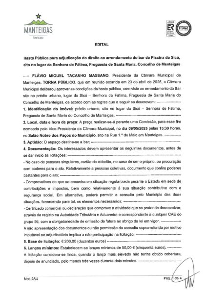 Hasta Pública para adjudicação do direito ao arrendamento do bar da Piscina da Sicó, sito no lugar da Senhora de Fátima, Freguesia de Santa Maria, Concelho de Manteigas