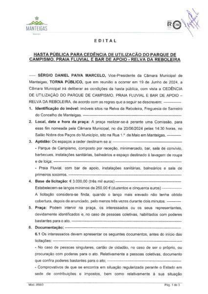 Hasta Pública para cedência de utilização do Parque de Campismo, Praia Fluvial e Bar de Apoio – Relva da Reboleira