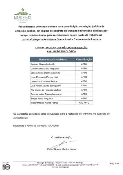 Lista Intercalar do Método de Seleção – Avaliação Psicológica – Cantoneiro de Limpeza