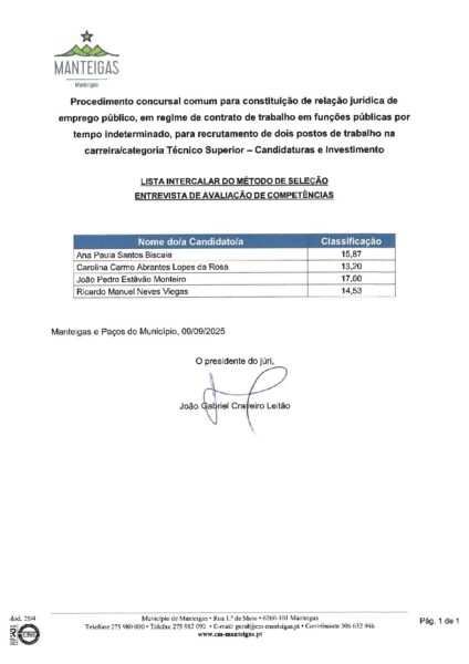 Lista Intercalar do Método de Seleção – Entrevista de Avaliação de Competências – Candidaturas e Investimento