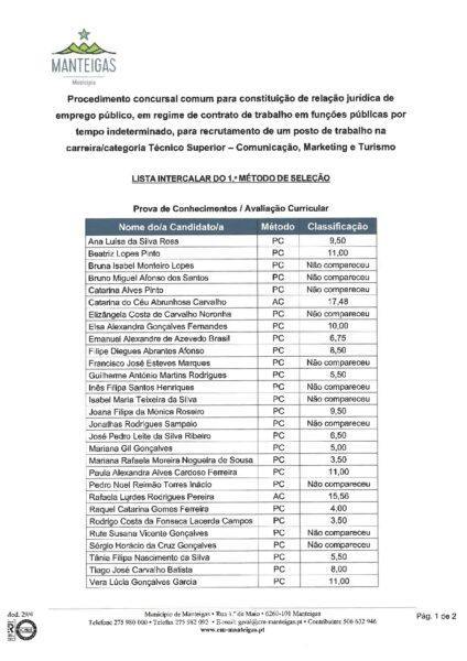 Lista Intercalar do 1º Método de Seleção Prova de Conhecimentos e Avaliação Curricular – Procedimento Concursal – Técnico Superior – Comunicação, Marketing e Turismo