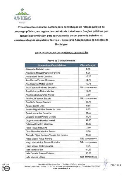 Lista Intercalar do 1º Método de Seleção Prova de Conhecimentos – Procedimento Concursal – Assistente Técnico – Secretaria Agrupamento de Escolas de Manteigas