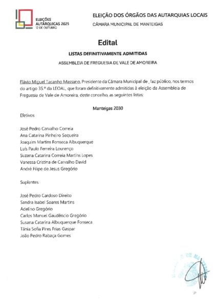 Listas Definitivamente Admitidas à Eleição da Assembleia de Freguesia de Vale de Amoreira