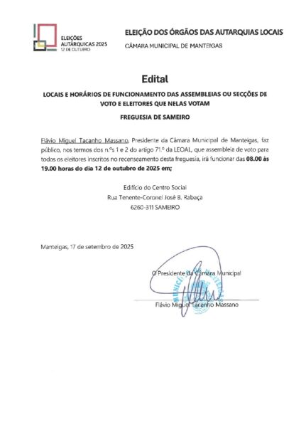 Locais e horários de funcionamento das Assembleias de voto e eleitores que nelas votam – Sameiro