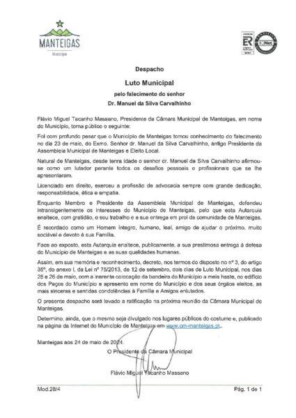 Luto Municipal pelo falecimento do Senhor Dr. Manuel da Silva Carvalhinho