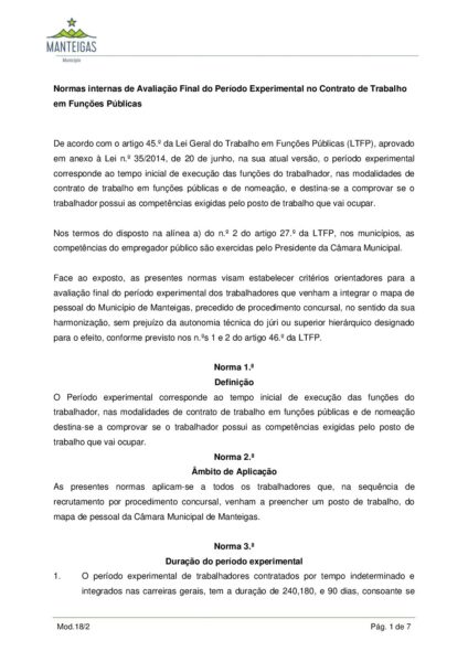 Normas internas de Avaliação Final do Período Experimental no Contrato de Trabalho em Funções Públicas
