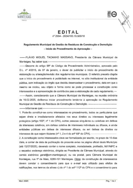 Regulamento Municipal de Gestão de Resíduos de Construção e Demolição – Início do Procedimento de Aprovação